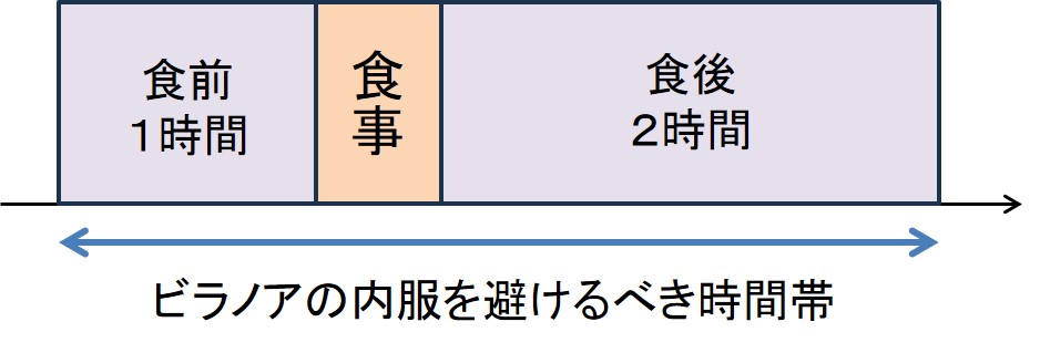 つまり、ビラノアを飲む「前後」には、胃の中に食べ物がない状態を作っていただく必要があるのです。