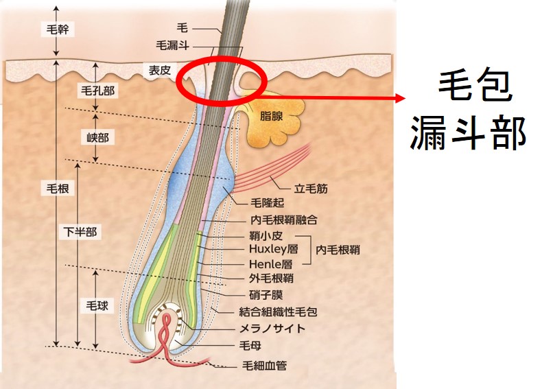 毛包漏斗部(もうほう-ろうとぶ)とは、皮膚表面に最も近い部分であり、皮脂腺の開口部から皮膚表面までの漏斗状の管を指します。