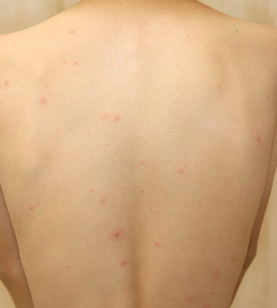 ウイルスが血液を巡って全身に広がり、体中に赤くポツポツとした症状が出ます。